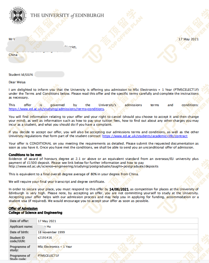 先恭喜小胡同学收到爱丁堡大学offer,小胡同学从一开始开始就有很明确的目标。因为爸爸是做电子这一类工作,所以从小就耳濡目染。在本科期间也是读的电子信息工程专业,入读大学后,随着对本专业的学习和考试,认识到国外科技迅速的发展和留学的紧迫性。