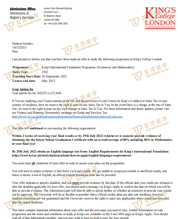 伦敦国王学院offer来袭,恭喜李同学圆梦成功!