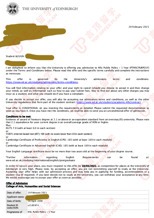 顾问老师建议我申请一些国外靠前的名校,然后给出了一些相关的实习规划。让我显得更加有优势,既有了理论知识,又有实践经历。在ps写作中,老师也是给出了我许多的建议。比如“成功的陈述从未偏离过我是谁、我能提供些什么这两个主题介绍自身,描述你作为有竞争力候选者的潜能”等等。其实能申请到爱丁堡大学,我感觉到十分的知足了,大家不是常说“知足者常乐吗”?在此不得不感谢老师们的努力,同时也希望大家能拿到自己梦校的offer!