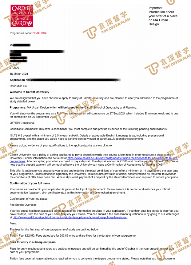 在准备好作品集以后,我找到言顶留学,希望她们能助我一臂之力,完成自己的梦想。老师们也是十分的负责,给我介绍院校,通过我自身的情况去选择合适的学校。平时准备材料上,老师也是细心指导、耐心解答。文书老师不断和我强调中心点在哪,以及写作的重点和注意点。在老师们共同的努力下,总算是拨云见日,拿到了卡迪夫城市设计文学硕士的offer。感谢老师之余,希望大家也能申请到自己理想的院校,为了梦想加油奋斗!