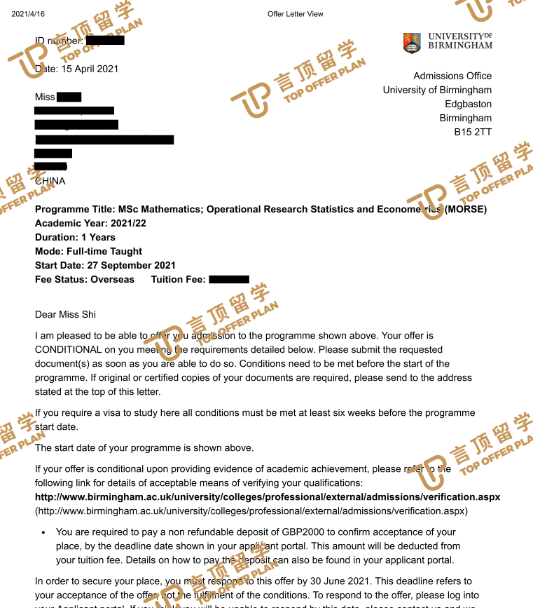 在材料递交的时候,老师还会细心的提醒材料是否有遗漏的。在等offer的时候,每天有点紧张和焦躁,就会时不时的去找老师聊天。老师也是不厌其烦的安慰我,感觉太有爱了!在焦虑的等待过后,总算是等到了伯明翰大学的offer,我想我已经做好了准备,希望在毕业后是一个全新的自己。在投入到工作中,能将所学的知识与其结合起来。