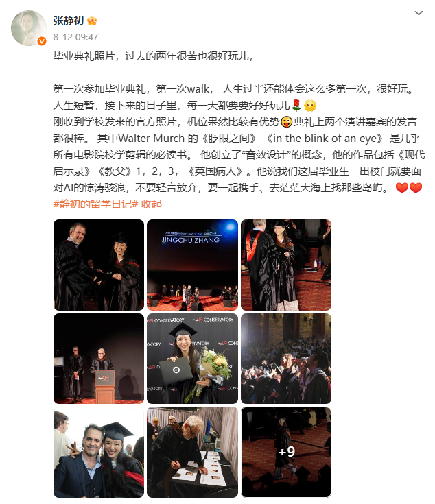 上月,张静初在社交平台上分享了自己美国研究生毕业典礼的照片,还有四个月她就将从美国顶级电影学院AFI顺利毕业。