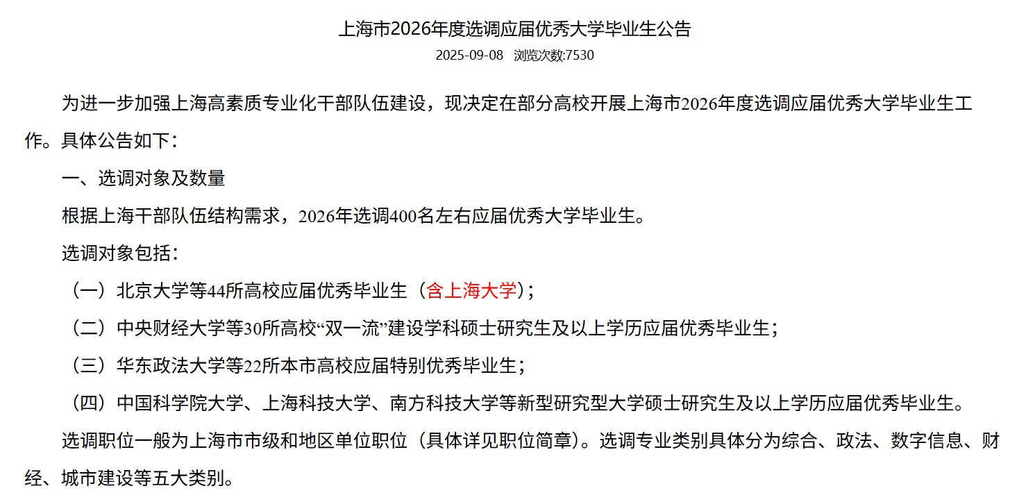 (图源:上海市2025年度选调应届优秀大学毕业生公告)