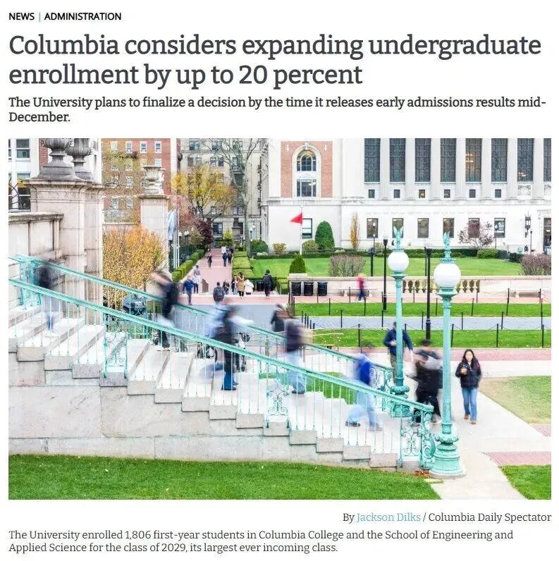 史诗级扩招”成为2026年美国顶尖高校的关键词。哥伦比亚大学的扩招计划尤为引人注目:该校正讨论将本科招生规模扩大20%,而2029届已悄悄实现1806人的录取规模,较上一届增长20%,若持续扩招将新增300余个名额。