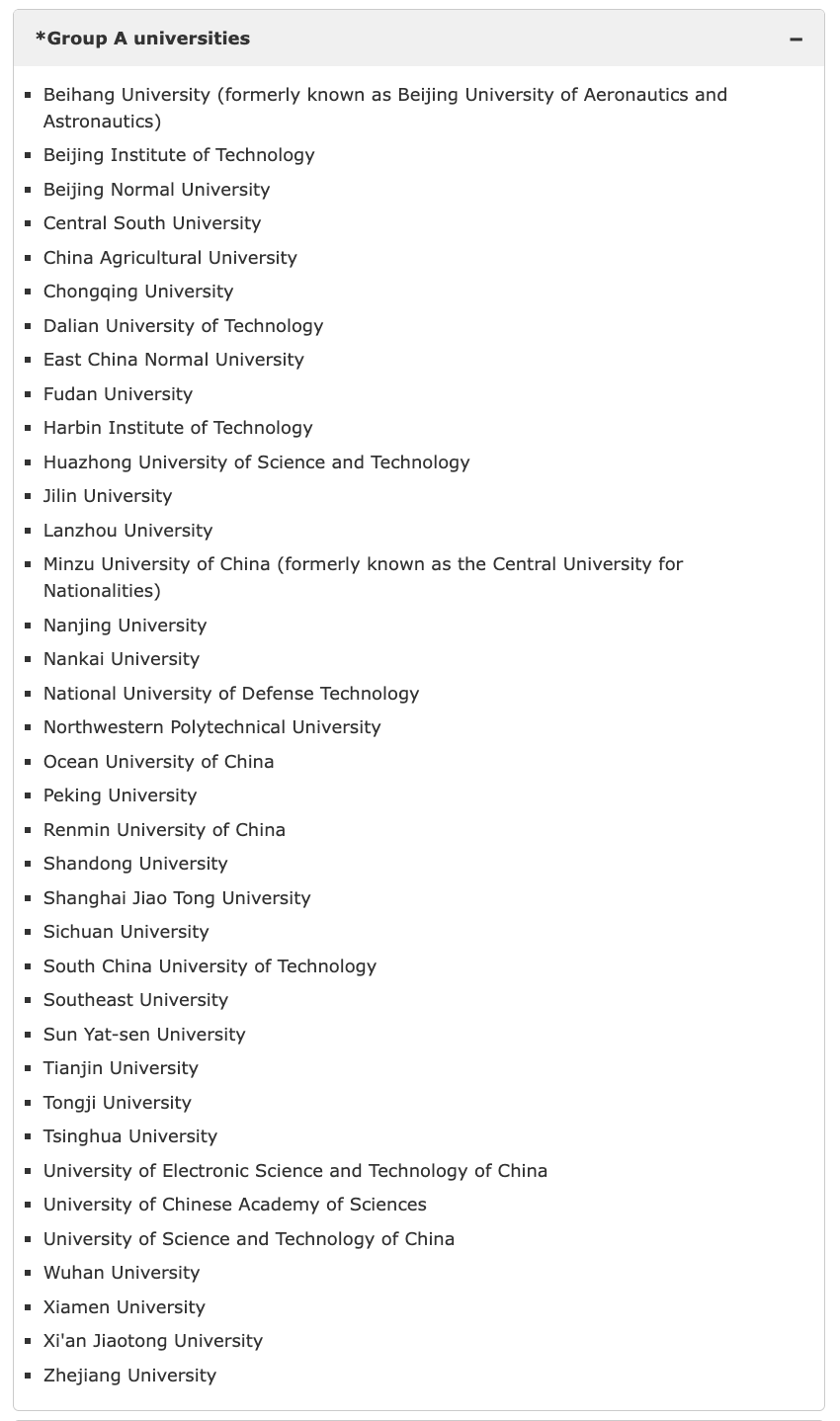 中国大陆地区的学校院校被分为A、B及其他院校,共三组:A组有37所高校,基本为985高校;B组有81所高校,基本为211+双一流高校,第三组则是AB两组之外其他受认可的高校。